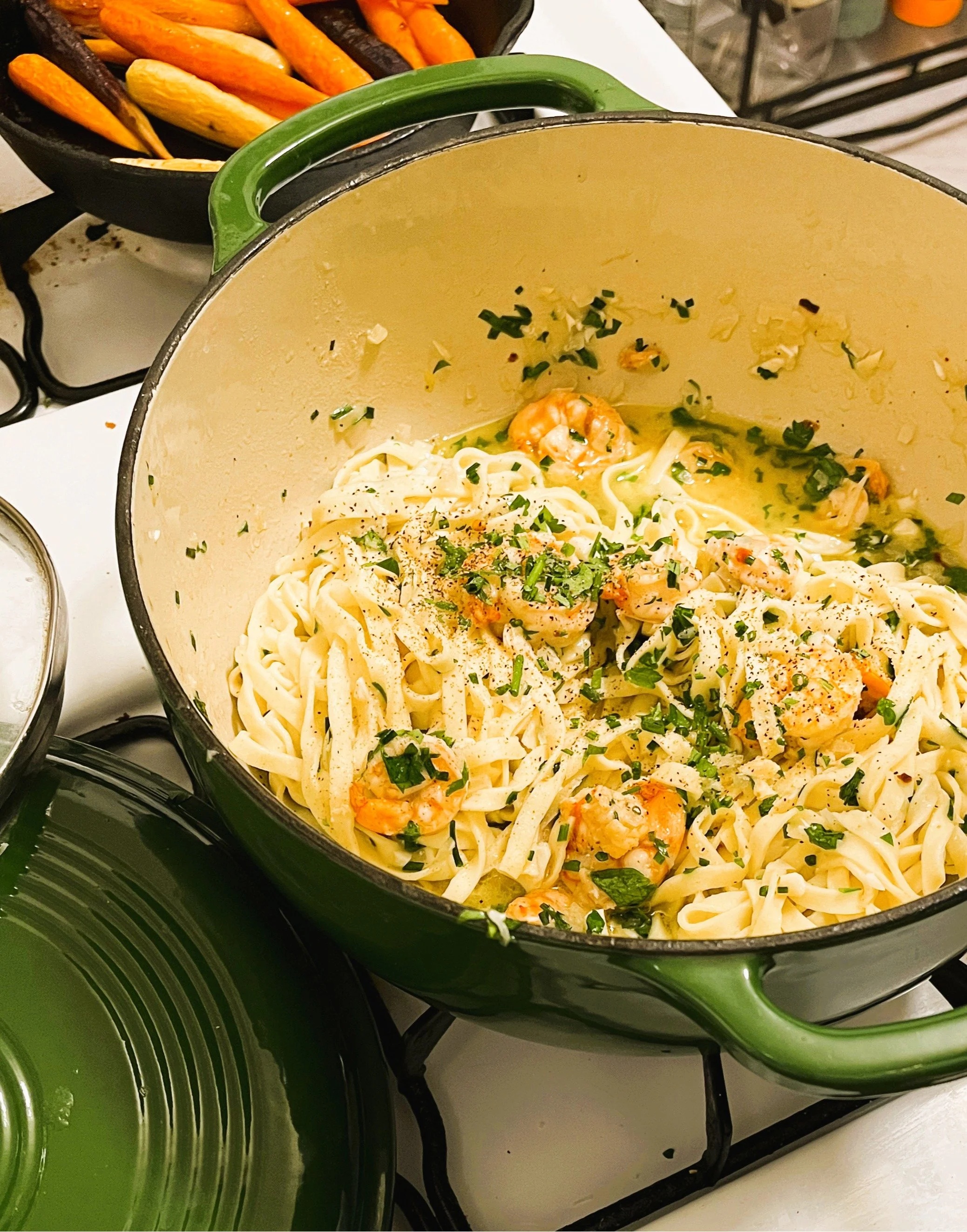 Add the cooked pasta to the pot with the butter and shrimp. Toss it together and add in the chopped parsley, chives. Toss until all noodles are coated with delicious sauce!